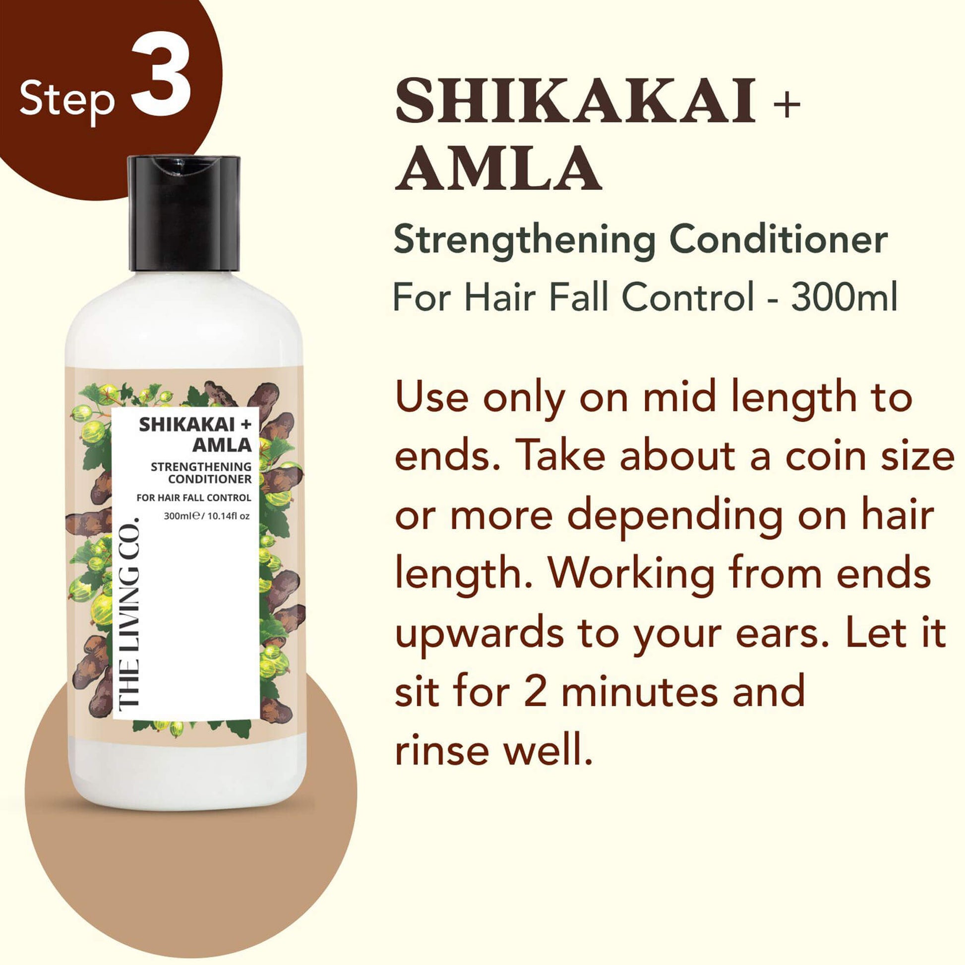 - Massage a generous amount of shampoo into your wet hair. Work it into a lather and massage the scalp with fingers. Give a good rinse and follow with The Living Co. conditioner.